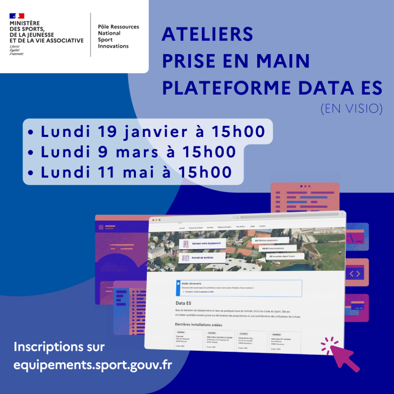 L'équipe DATA ES vous propose 3 sessions en ce début d'année 2026 pour vous perfectionner et en connaitre davantage sur DATA ES, la plateforme de recensement des équipements sportifs en France.